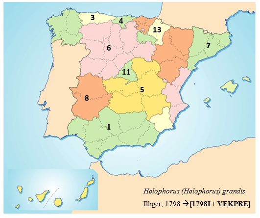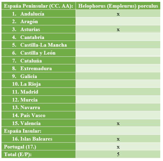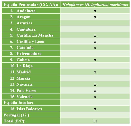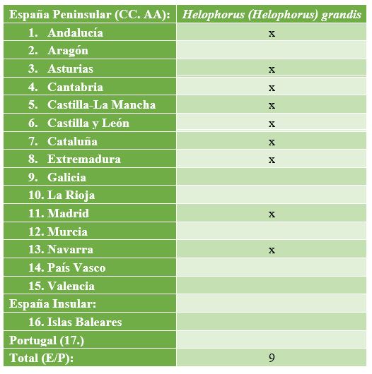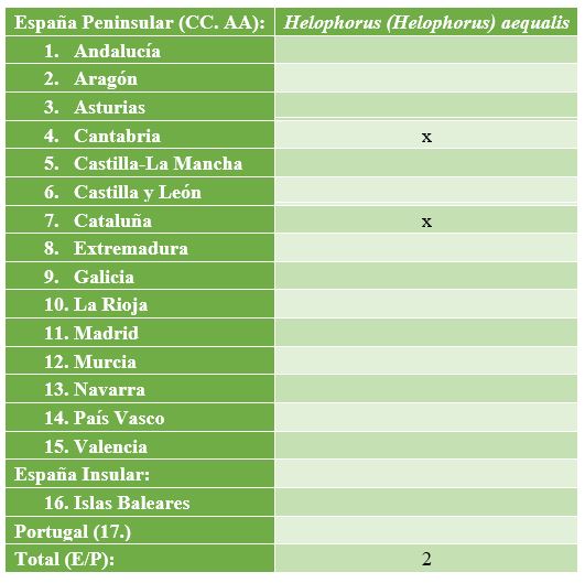 TABLA de presencia/ausencia en Comunidades Autónomas (CC. AA.) de España y Portugal para Helophorus (Helophorus) occidentalis Angus, 1983. Link: [https://dili-up.com/wp-content/uploads/2020/05/Helophorus-Helophorus-occidentalis-Tabla.jpg]